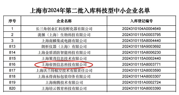 9月5日,上??茖W技術委員會發布的《上海市2024年第二批入庫科技型中小企業名單》,上海帝圖信息科技有限公司再次上榜!